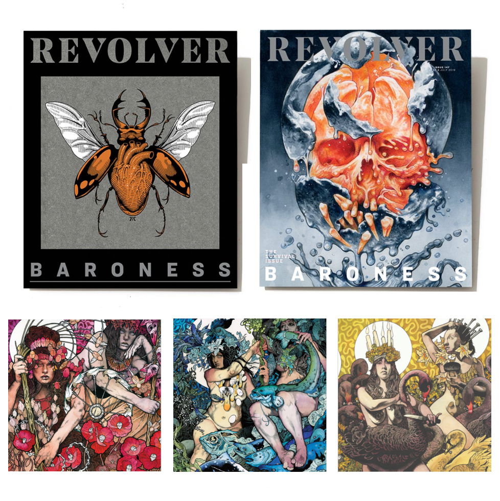 This limited edition of 250 hand-numbered silkscreen slipcases printed by Kayrock Screenprinting in Brooklyn, New York, features artwork by longtime Baroness collaborator and artist Marald van Haasteren. This four-color print on Black Licorice French Paper is custom to perfectly fit, display and protect your limited edition magazine, featuring commissioned artwork for Revolver’s JUNE/JULY 2019 cover by artist and Baroness vocalist-guitarist John Dyer Baizley. This cover is only available in this exclusive package.