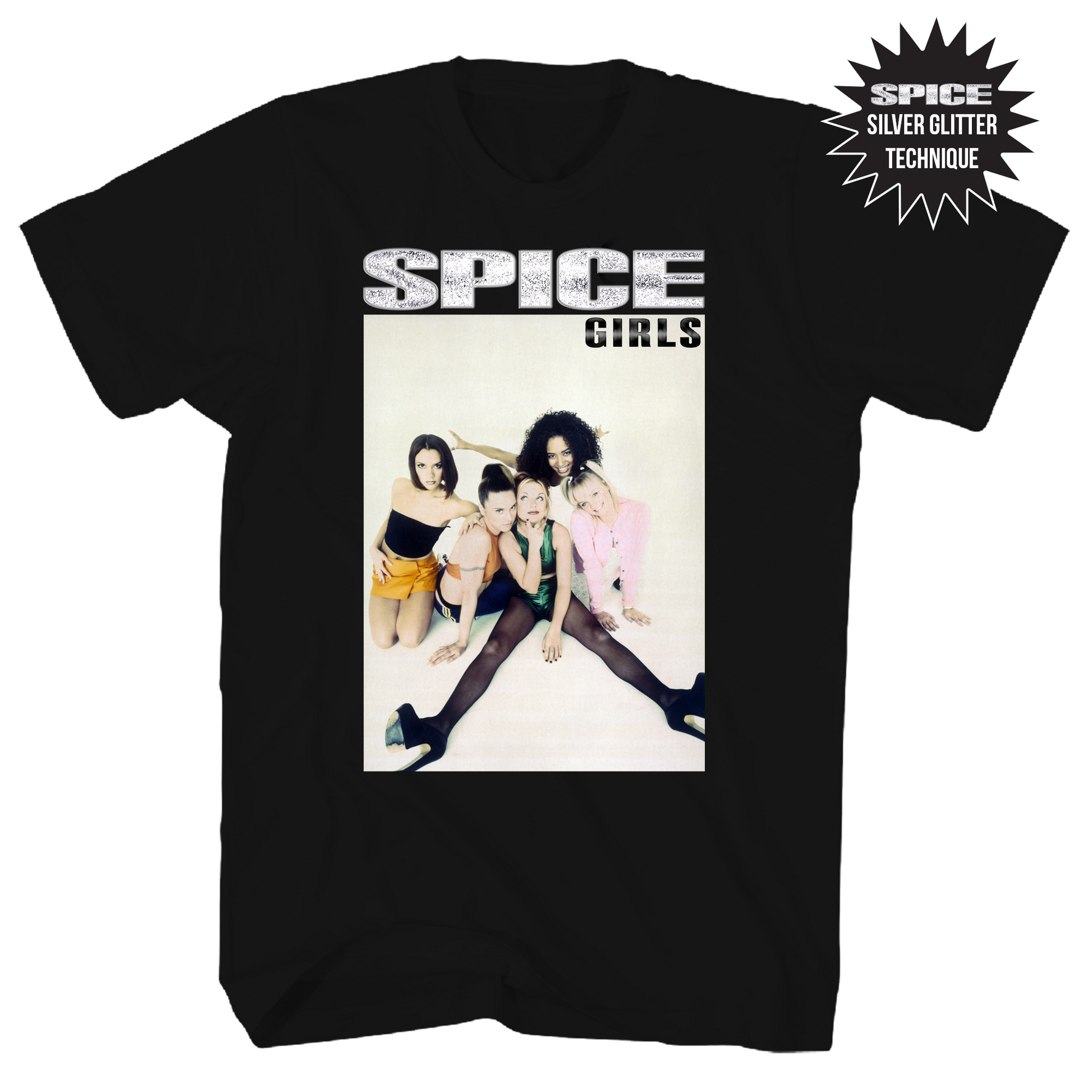 SPICE GIRLS SILVER GLITTER GROUP PHOTO FRT/BACK BLACK T-SHIRT